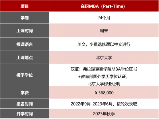 学费:2023 级北大-弗拉瑞克商学院 MBA项目在职班学费总额为人民币36.8万元,分两次缴纳。