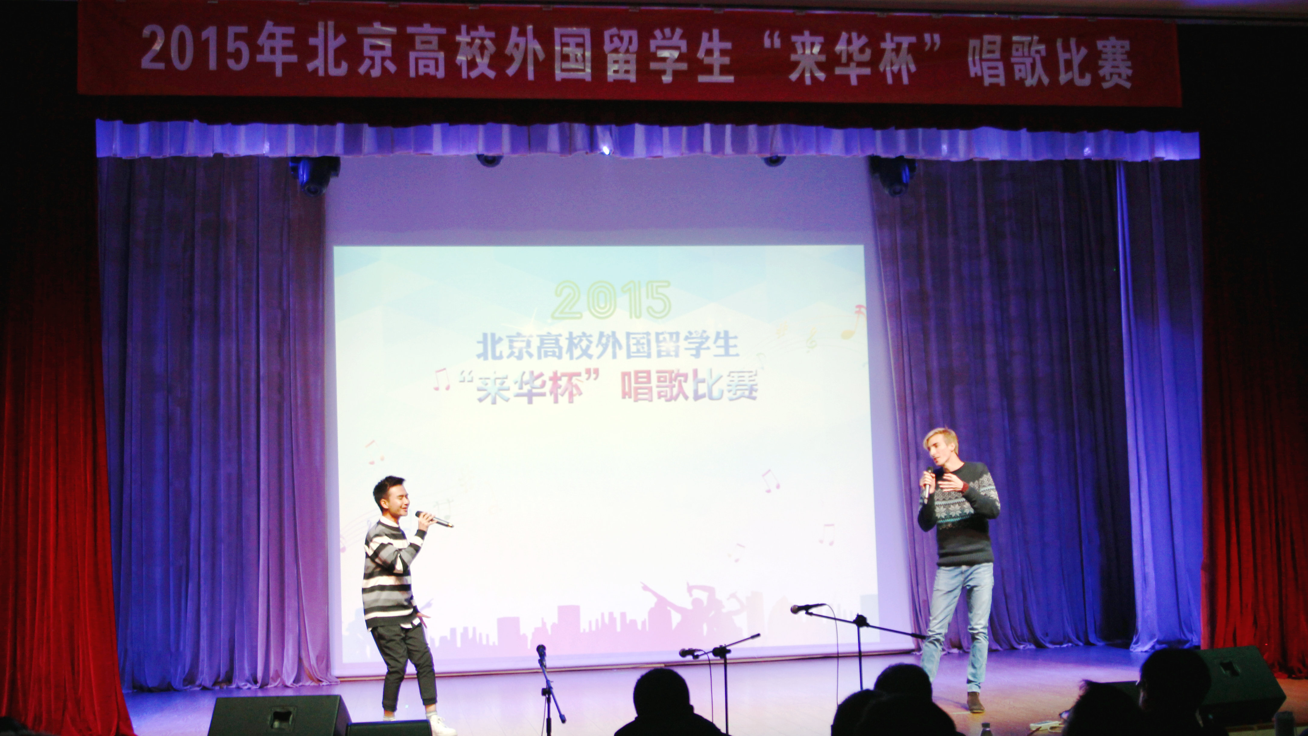 2015年11月29日上午八时三十分,北京高校外国留学生“来华杯”唱歌比赛决赛抽签在中国青年政治学院乐群楼演播厅开始,选手随机抽取比赛次序,我校留学生迷丽的吉他弹唱、洪健城与魏途斌组成的男声小合唱分别抽取第十二号和第十五号。决赛于九时正式开始,洪健城与魏途斌两人身着蒙古族传统服装,展示了精心准备的歌曲《鸿雁》,迷丽也表现优秀,以与预赛有所不同的轻快甜蜜的风格重新演绎了《龙卷风》。