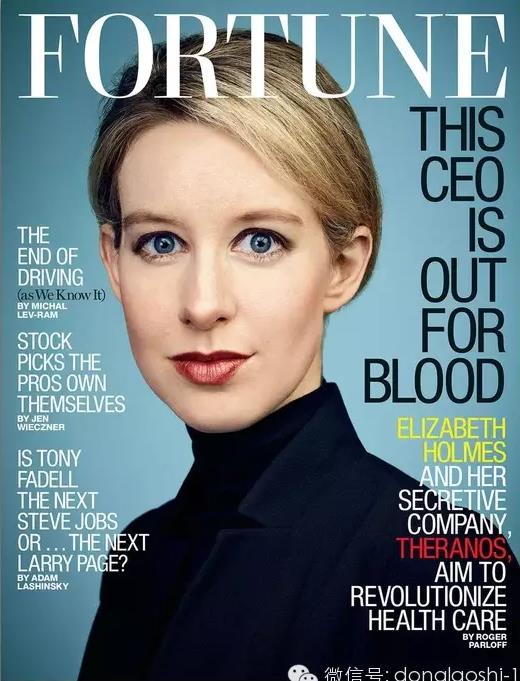 伊丽莎白·福尔摩斯(Elizabeth Holmes),三十一岁,是硅谷估值高达90亿美金创业公司Theranos的创始人和CEO。公司的名字由“therapy”(疗法)和“diagnosis”(诊断)两个词组成。她于十九岁从斯坦福退学创办Theranos,Theranos已经研发出数十种疾病的血液检测方法,需要的只是从手指采集一到两滴血液,而价格是传统检测的1/10。Elizabeth Holmes 2002年曾在北京大学学习中文。