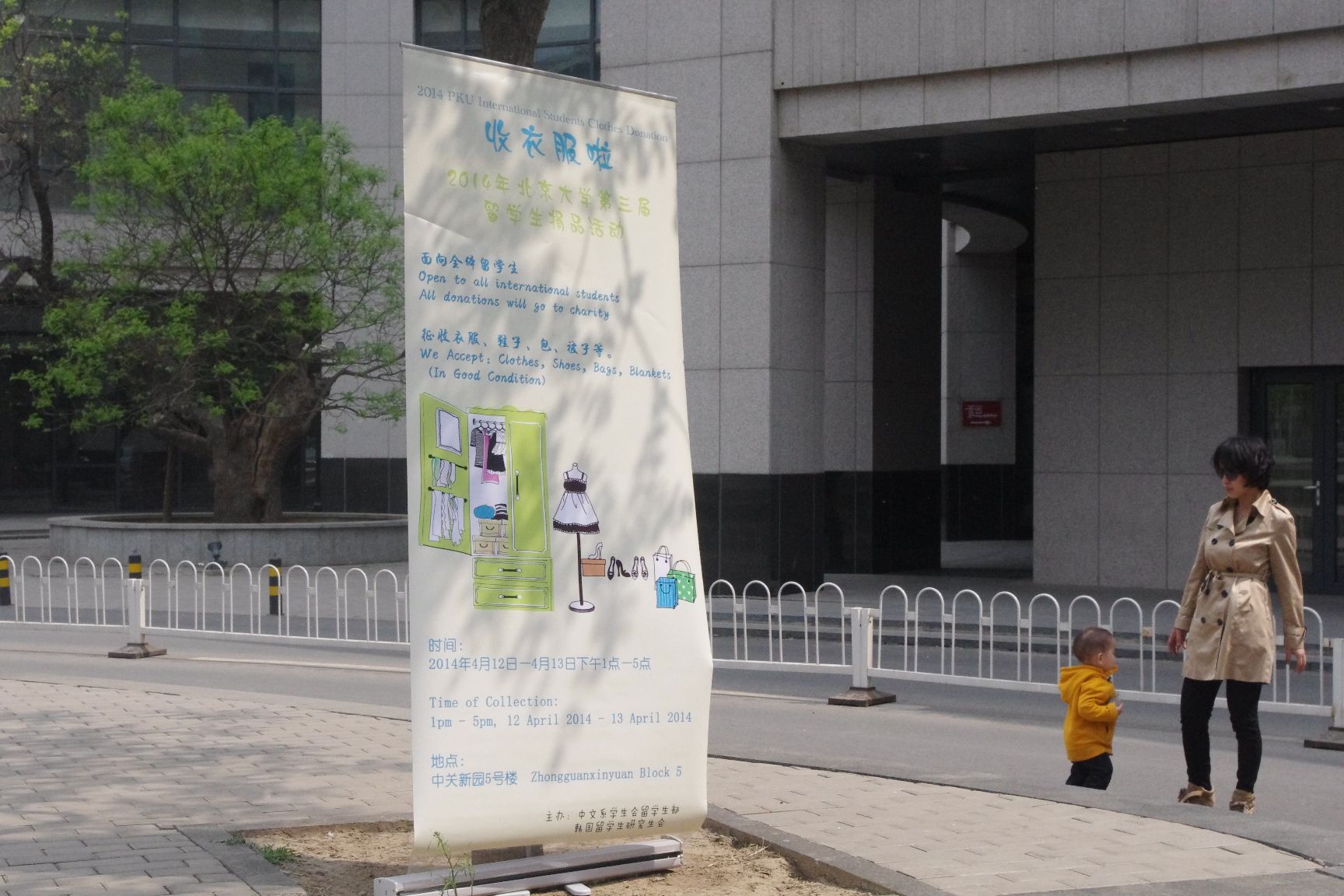 由中文系学生会留学生部和韩国留学生研究生会联手举办的“2014年北京大学留学生捐品活动”圆满落幕。在4月12日、4月13日短短的两天时间内,我们获得了同学们和热烈反响,第一天便获得了1032件衣物的捐赠,第二天数量更是有增无减,得到了新的1045件衣物,共计2077件。所得衣物将全部捐往北京市石景山区名为“同心希望家园”的农民工子弟社区。