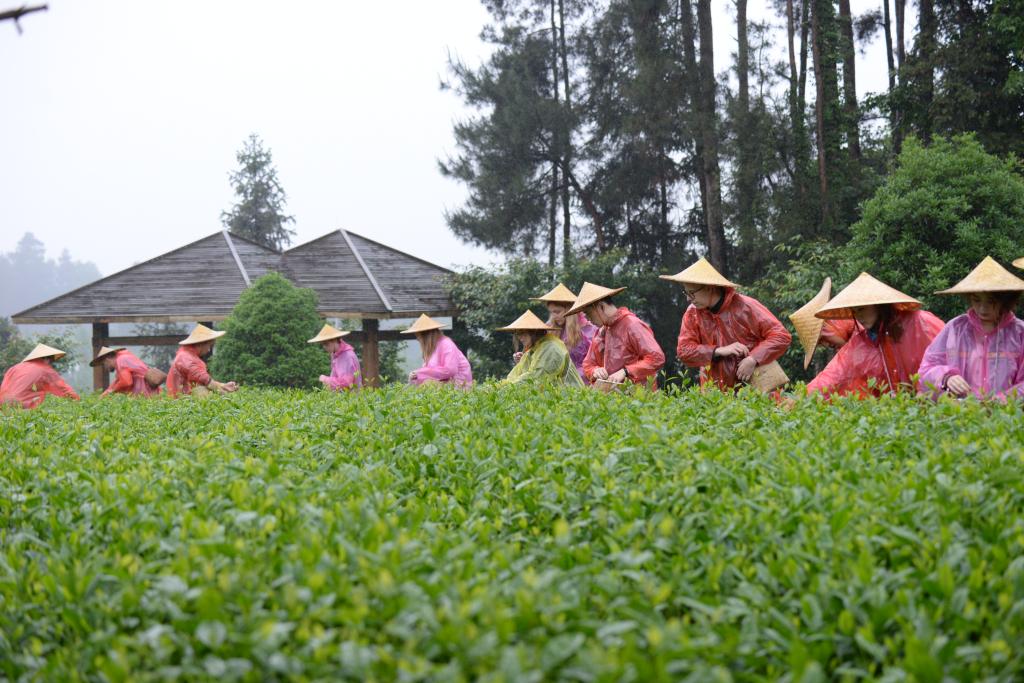 为了解贵州当地生态文明建设和特色产业发展,同学们还来到了遵义市湄潭县。这里也曾经是浙江大学的西迁校址所在地,不仅生态优美,而且人文荟萃。绿水青山就是金山银山,今日的湄潭以茶闻名天下,被誉为“中国名茶之乡”,是贵州省最大的茶叶基地。“湄潭翠芽”是其知名品牌,在生产上实行统一规范化管理,即“品种统一,种植统一,生产加工统一,包装统一”。同学们走进茶企听取茶文化和产业发展介绍,并在细雨中走上茶山采摘茶叶,鲜艳的雨披绽放在一望无际、莽莽青青的茶山间,构成一幅美丽生动的初夏采茶图。大家在知行合一的劳动体验中,深刻体味充满中国韵味的茶文化,亲身感受当地蓬勃发展的茶产业。