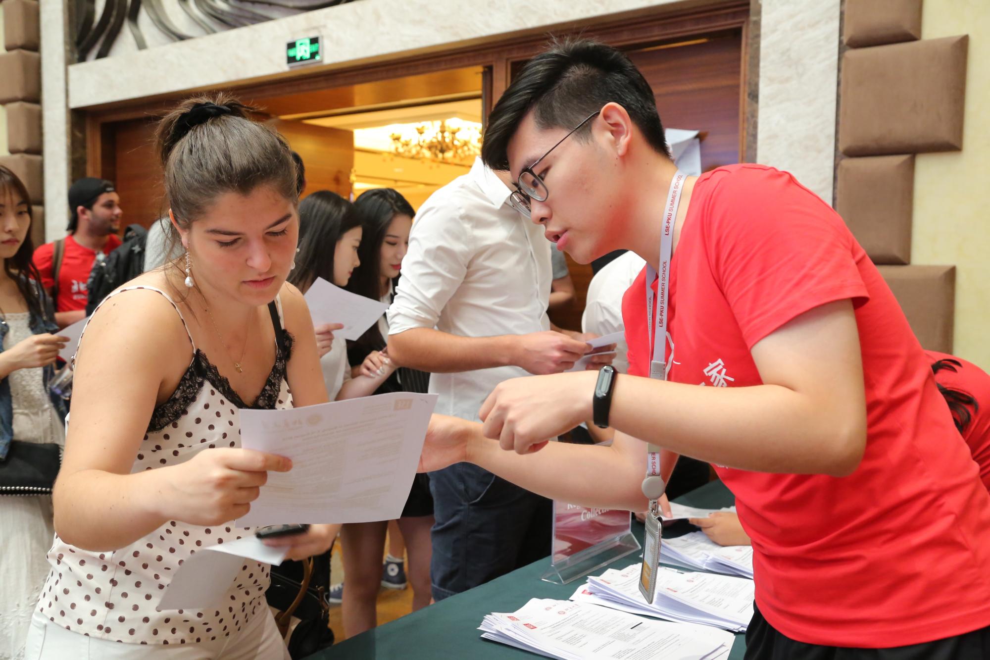 8月4日上午,LSE-PKU暑期学校在英杰交流中心举行报到注册以及开学典礼。中午12点,暑期学校的报道注册环节正式开始。身穿“留学北大”logo红色T恤的助理团队紧锣密鼓地进行着报道注册工作,他们分工明确,协调有序。前来报道注册的学生们首先在助理的引导下查找学号,之后井然有序地前往各个柜台领取信息确认单、校园卡、项目定制手提袋、T恤以及课程阅读资料,完成所有流程后便进入阳光厅内安静等候参加开学典礼。助理们热情洋溢地同来自五湖四海的同学们打招呼,细致耐心地为学生答疑解惑,注册流程高效有序。