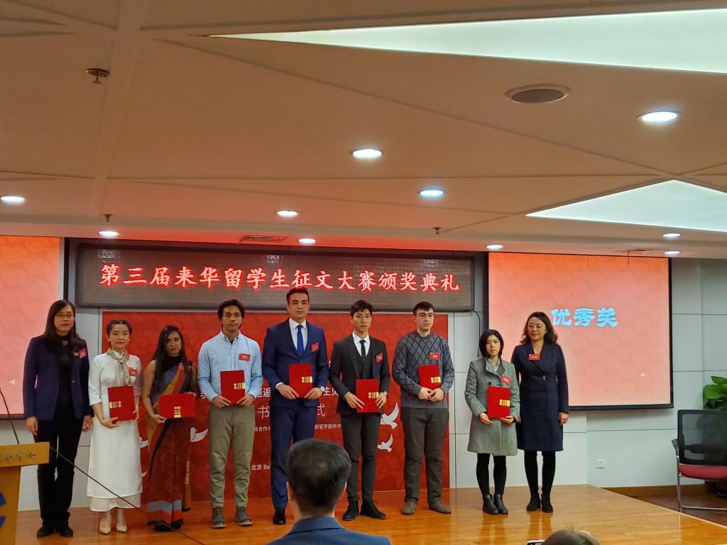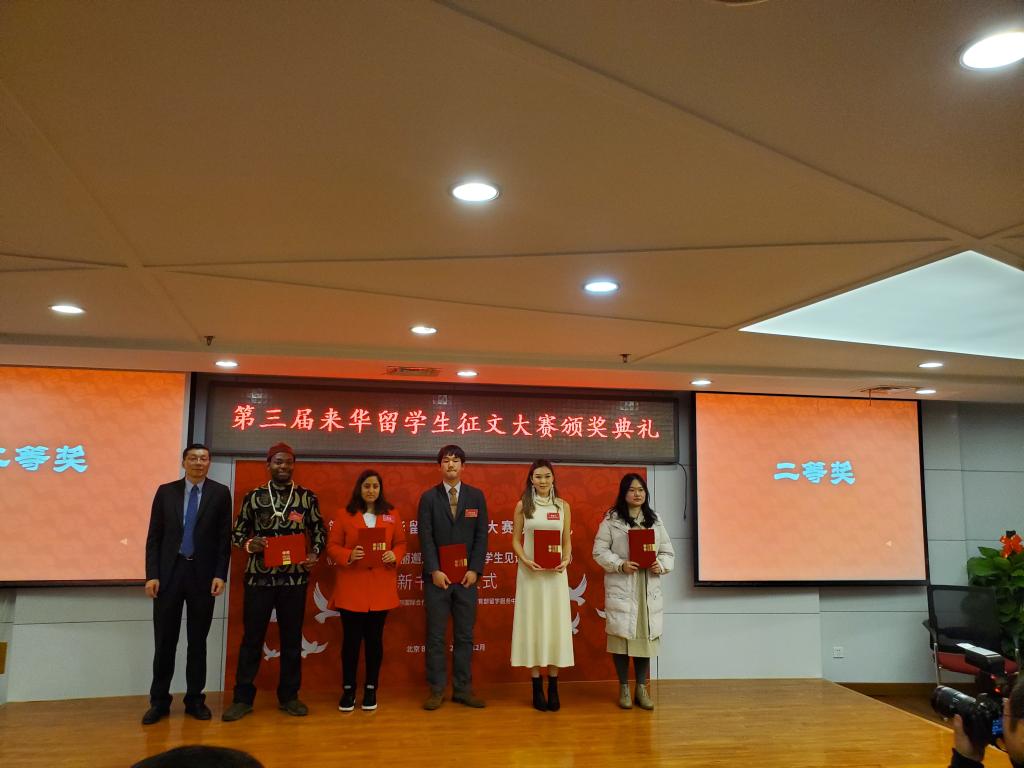 2019年12月20日,第三届来华留学生征文大赛颁奖典礼暨《我与中国的美丽邂逅——来华留学生见证壮丽70年》新书发布仪式在北京成功举办。此次活动由教育部国际合作与交流司主办,教育部留学服务中心承办。征文大赛于2019年5月正式启动,大赛组委会共收到来自80余所院校机构及个人投稿,共计670余件,最终评出一等奖5名、二等奖8名、三等奖16名和优秀奖31名。获奖作品以中文写作,文章流畅优美,内容丰富多彩,并以《我与中国的美丽邂逅——来华留学生见证壮丽七十年》为书名结集出版。