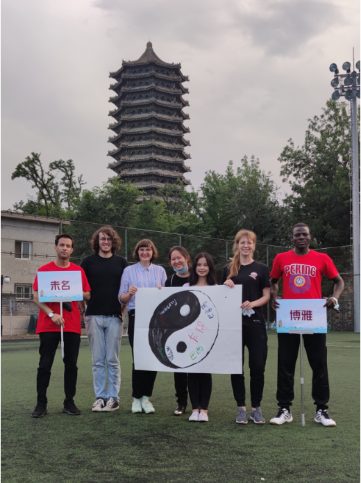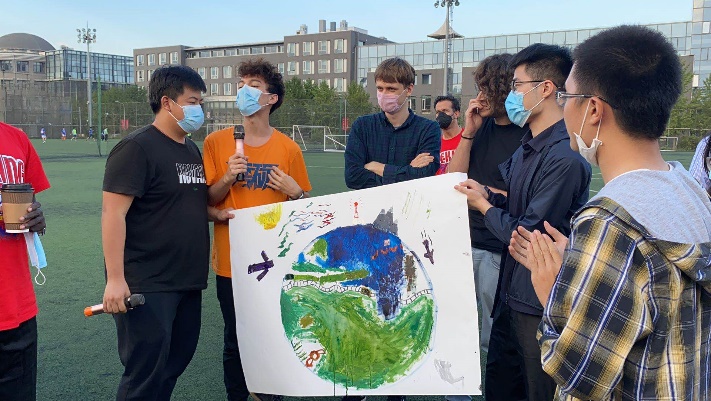 随后的合作绘画环节,一张无限可能的白纸加上同学间的思维碰撞,色彩交融间,个性与共性得到了完美体现。或是爱好,或是美食,或是象征来处,或是寓意祝愿,鲜明的个人元素汇聚在一起,却是意外的和谐。“未名”“博雅”组在太极图上写下各自的国家名称,意为来自世界各地的同学在中国包容万物的阴阳平衡中达到融洽;另一幅画中,同学们在地球上画上了各地的标志性事物和一条贯通的铁路,不仅表现了同学对人类命运共同体的深刻理解,也体现了“一带一路”倡议在全球合作中的积极作用。其他画幅中,极具艺术感的水彩线条在白纸上纵横交织,最终汇于一处,寓意不同文化背景的同学汇聚北大,在这里书写自己的人生,这不仅与北大兼容并包的特点相合,也是同学们对北大精神的解读与延伸。而“天”组以舒展的树干穿过“PKU”一词,并加以各色枝叶,具象化同学们扎根于北大这片学术的沃土,努力吸取知识养分,实现梦想的美好愿景。