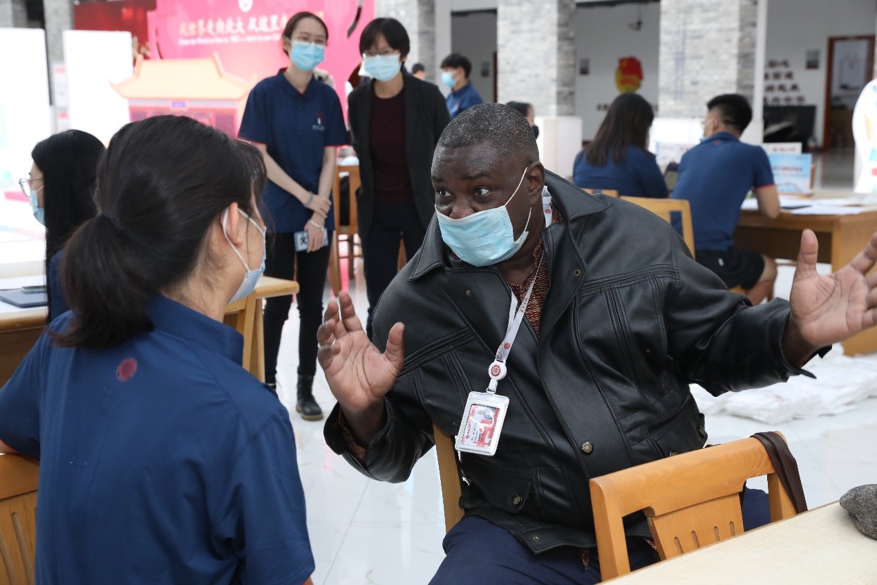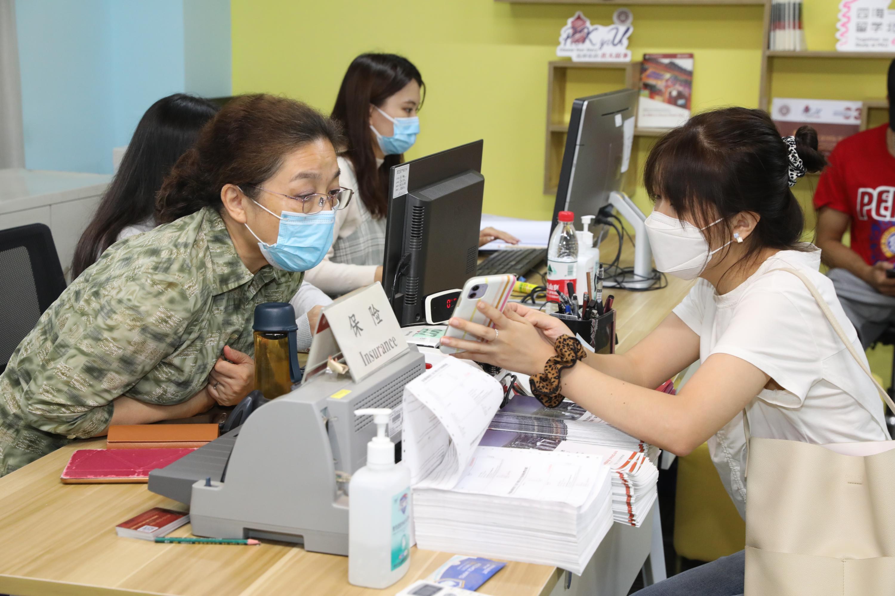 线下迎新环节既方便快捷也温暖周到。留学生办公室在新太阳中心门口设置志愿者咨询台,来自孟加拉的元培学院本科生阳光(SUNNY,MD MAHEDI HASSAN)和来自乍得的国际关系学院博士生托马(DONGLONA ADAWA,THOMAS)作为留学生学长,早早地就守候在门口为前来报到的新同学答疑解惑。新太阳中心三层专设线下注册办公室,志愿者协助老师帮助线下留学生进行报到注册,还专设为留学生办理签证、保险和缴纳学费手续的区域,并根据疫情防控要求,为等待的同学们布置了室内外休息室。办理完成注册和相关业务后,新生同学可以回到一楼大厅,在这里领取新生训练营专属服装和新生生活指导手册,办理住宿手续。