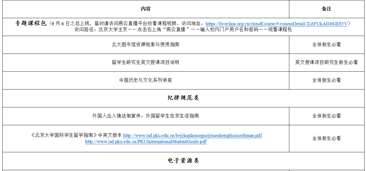 部分线上入学迎新课程包内容概览