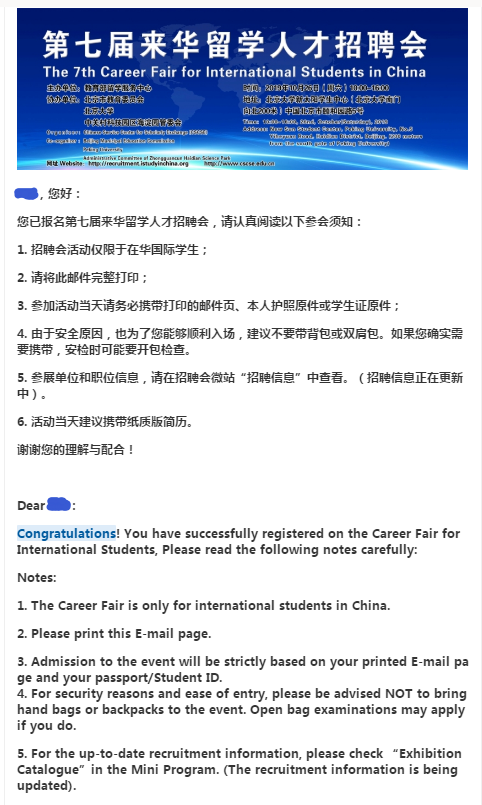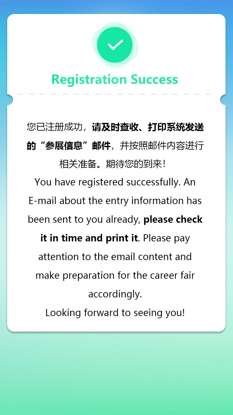 Step 3:Register in the Career Fair Mini Program. When you finish the registration, an E-mail about the entry information will be sent to you , please check it in time and print it.