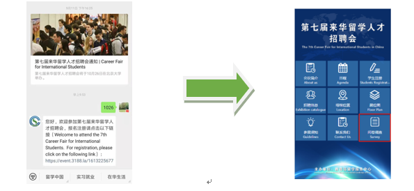 步骤2:在微信公众号对话框中输入“1026”,点击链接进入第七届来华留学人才招聘会微站,并填写调查问卷;