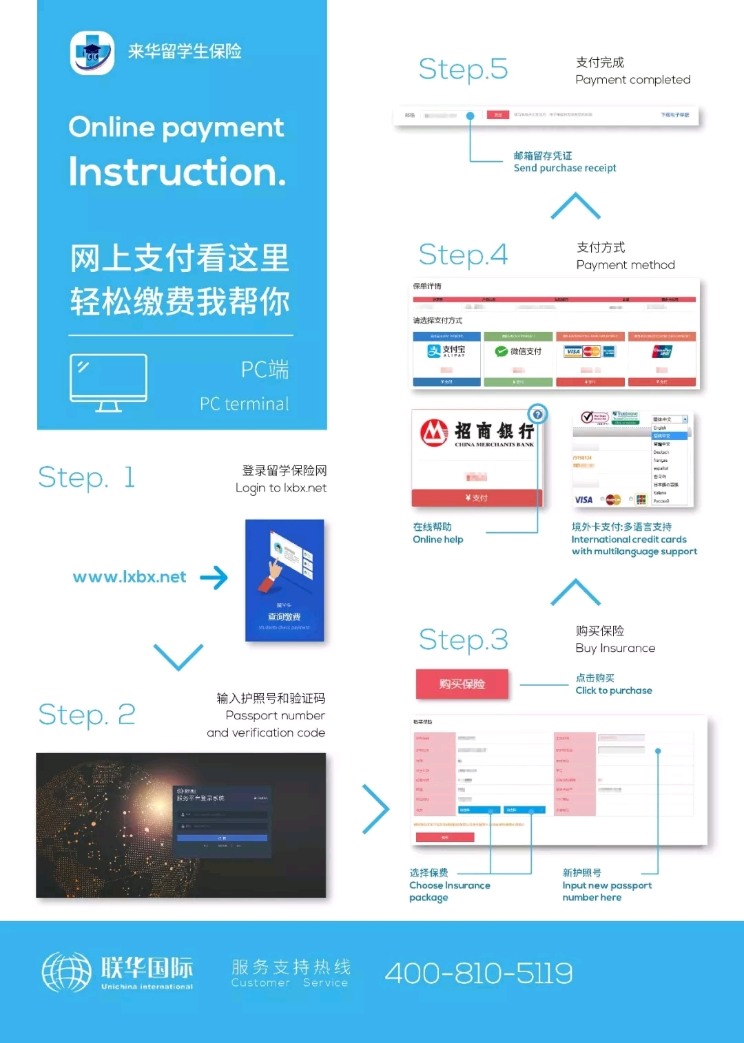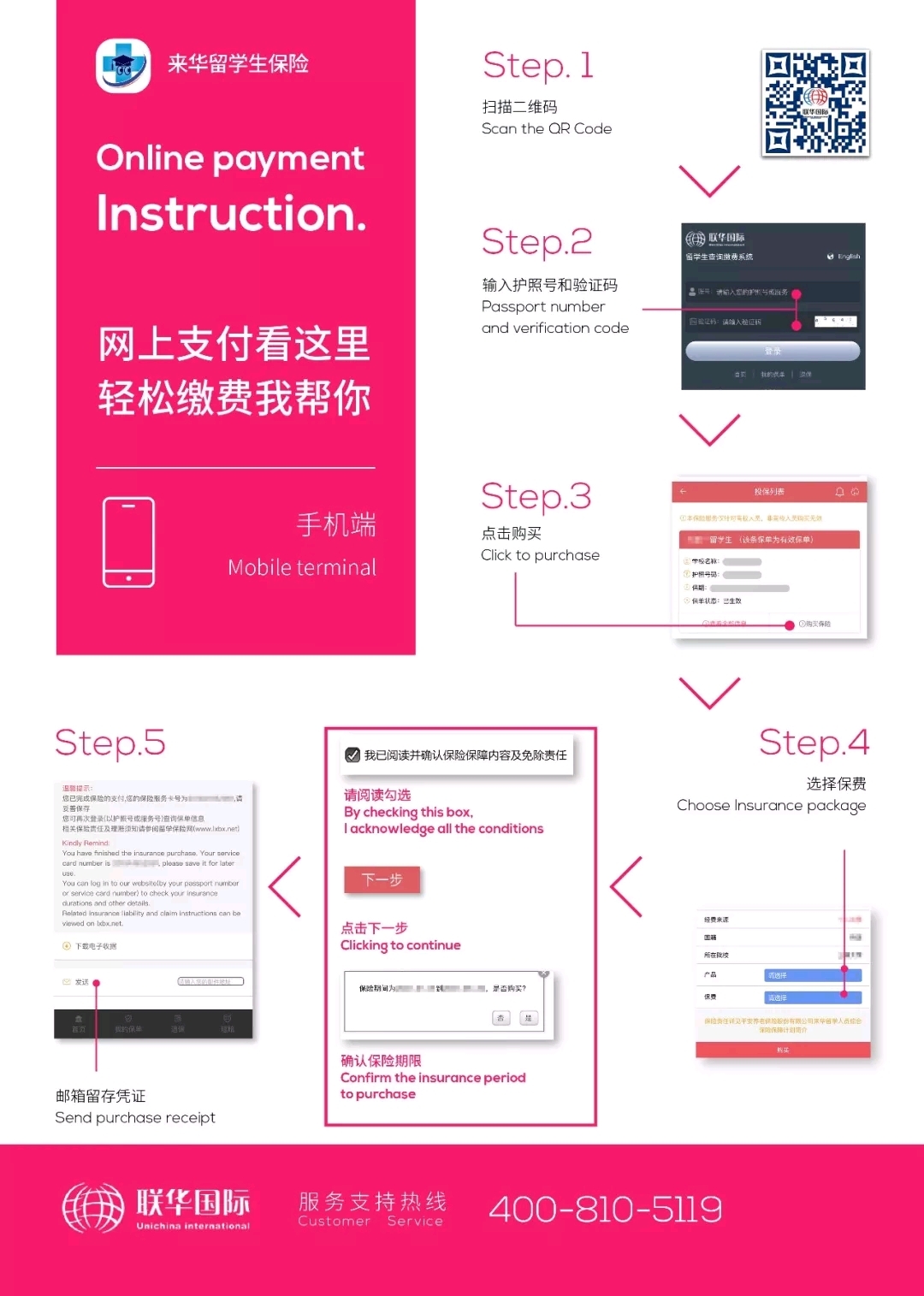 In addition, in order to ensure your insurance compensation during the outbreak of the virus, you may apply for the reimbursement online ( view the guide for claim settlement for details) or through a phone call for any queries. They have 24 hours of bilingual service at the customer service center ( Phone number: 400-810-5119).