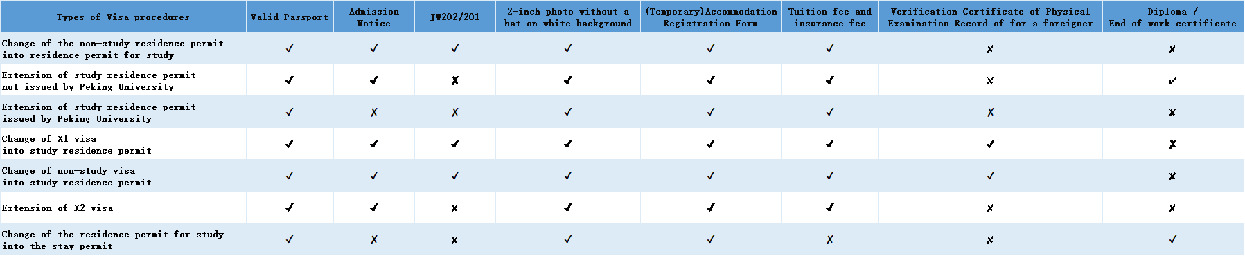 International students should apply for an X1 visa (for long-term study, more than 180 days) or an X2 visa (for short-term study, less than 180 days) at the nearest Chinese embassy or consulate in your country. To apply for a visa, students should submit the requested materials to the Chinese embassy or consulate as required, including a valid personal passport (valid for at least 6 months), admission notice (issued by the International Students Division, Peking University) or a certificate of enrollment (issued by the Graduate School or the PKU Undergraduate Education), and the visa application form for foreigners who are going to study in China (JW201/JW202 form). You will receive back the materials mentioned above when you get your visa and passport returned, as you will need these documents in order to go through follow-up procedures after your arrival to China.X1 Visa: The validity period of the X1 visa (the period of stay in China from the date of entry) is 30 days. International students are required to change their X1 visa to a residence permit for studies within 30 days after arrival.