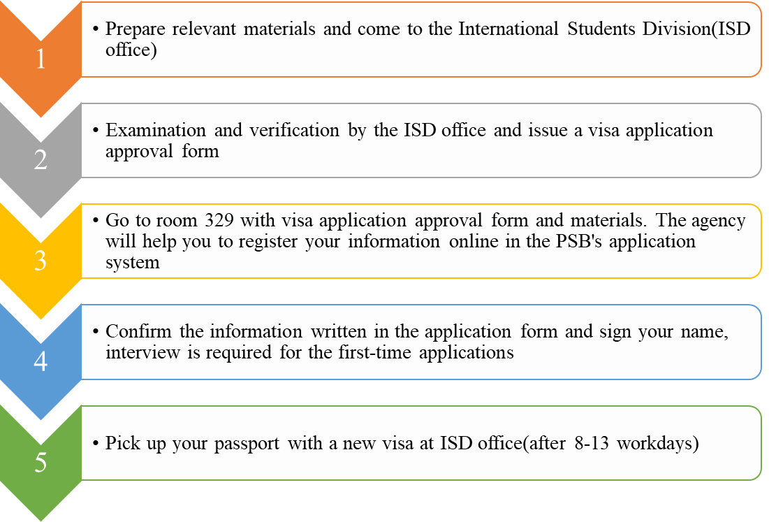 1. International students must hold a residence permit for study or X2 short-term study visa to study at the school. It takes 8 to 15 weekdays to go through the relevant procedures of the residence permit for studies, and 8 to 13 weekdays to process the X2 visa related procedures. Under normal circumstances, an application must be submitted within 30 days before the expiration of the visa, with time reserved, all necessary materials prepared, validity of the temporary accommodation registration in-formation confirmed, and relevant procedures completed on time.