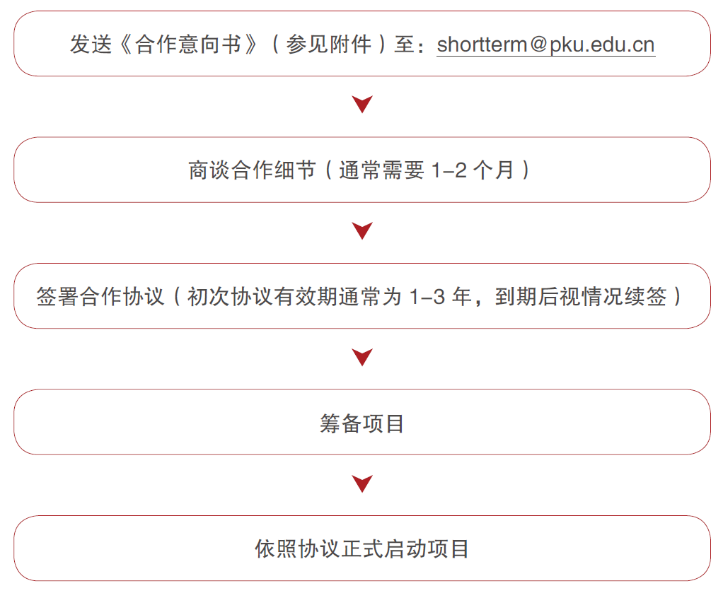 北京大学坚持开放合作战略,积极推进国际交流与合作,通过与海外知名大学和教育机构合作举办短期来华留学项目(团组合作项目),接收全球大批优秀青年学子来校学习,致力于为增进中外人文交流、促进世界和谐发展做出贡献。